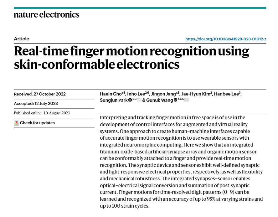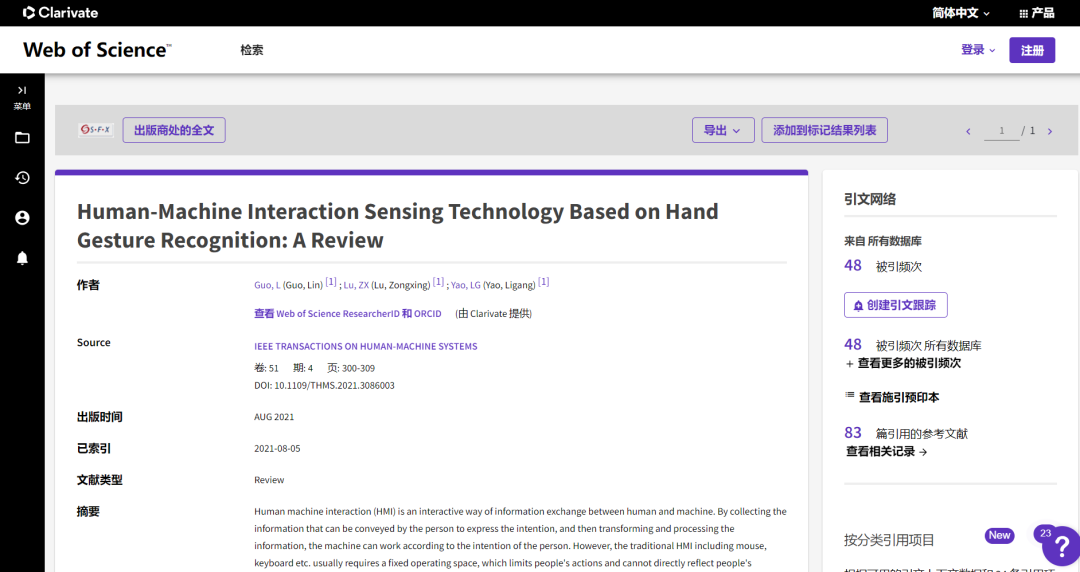 郭霖、卢宗兴和姚立纲共同编撰发表于IEEE Transactions on Human-Machine Systems, 2021年第4期的“Human-Machine Interaction Sensing Technology Based on Hand Gesture Recognition: A Review”一文,近期被《Nature》 旗下子刊Nature Electronics 2023年的论文“Real-time finger motion recognition using skin-conformable electronics”引用,详见其参考文献17。