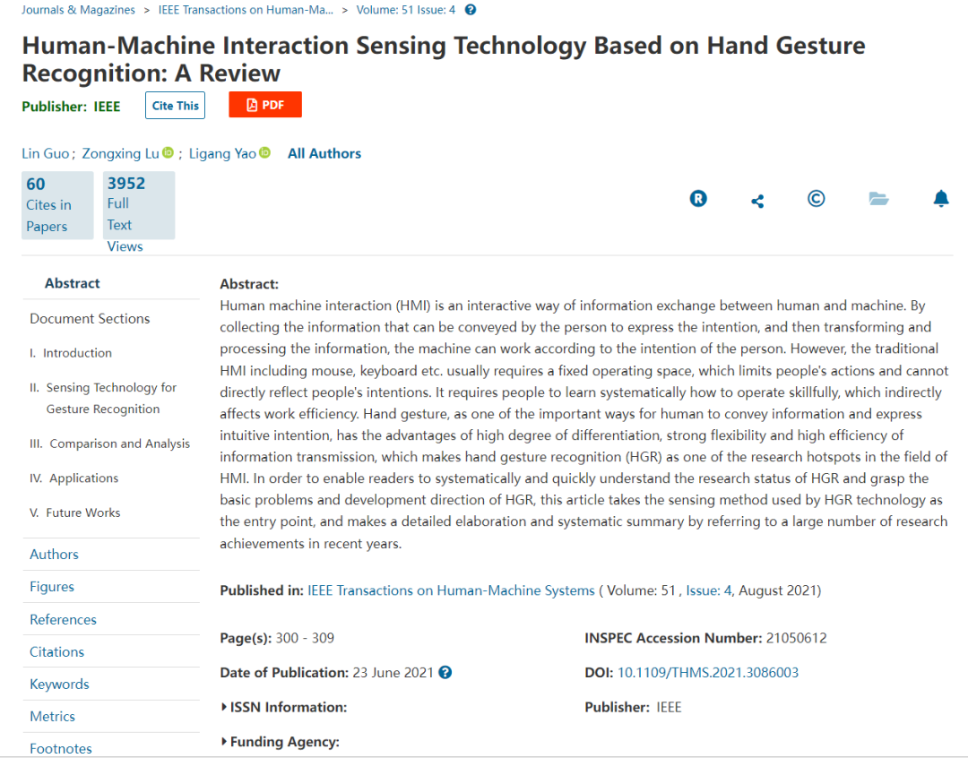 Human-Machine Interaction Sensing Technology Based on Hand Gesture Recognition: A Review该文由郭霖、卢宗兴和姚立纲教授共同编撰。本文旨在使读者能够系统、快速地了解手势识别的研究现状,揭示手势识别的基本问题和发展方向。文章以手势识别技术所采用的传感方法为切入点,通过总结近年来人机交互领域的研究成果,详细的阐述人机交互系统的研究现状,并展望未来人机交互领域的发展方向。目前,该论文在Web of Science上实时引用为48次。