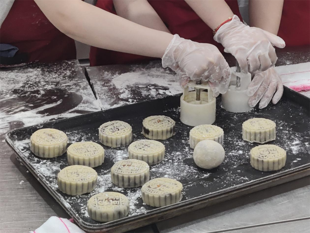 旗山校区紫荆园食堂参加由机械学院与校后勤管理处联合举办的“庆国庆·迎中秋·劳动美——广式月饼制作”主题活动。工作人员带领师生们进行了月饼烘焙的学习。