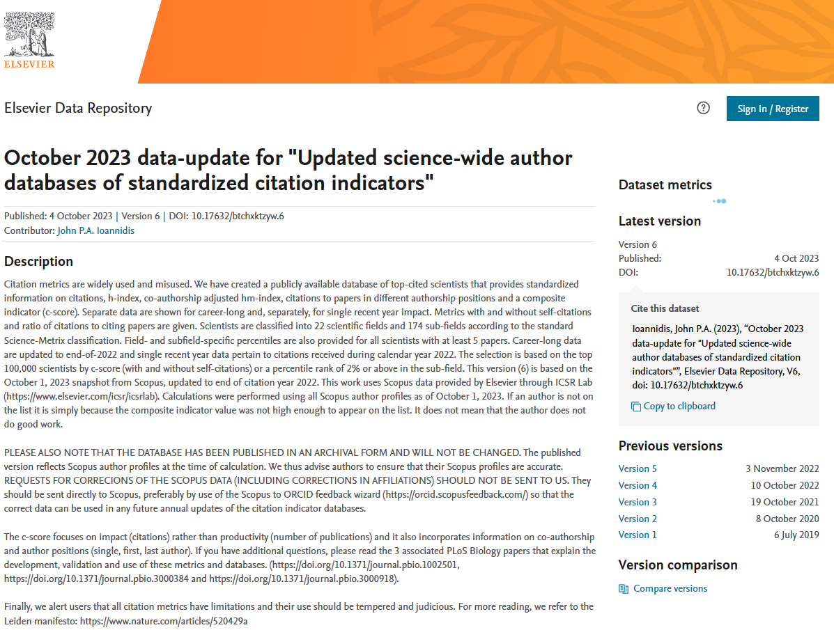 2023年10月4日,爱思唯尔(Elsevier)与美国斯坦福大学(Stanford University)更新了标准引文指标的全科学作者数据库,并发布了第六版《全球前2%顶尖科学家榜单2023》(World’s Top 2% Scientists 2023)。海角视频