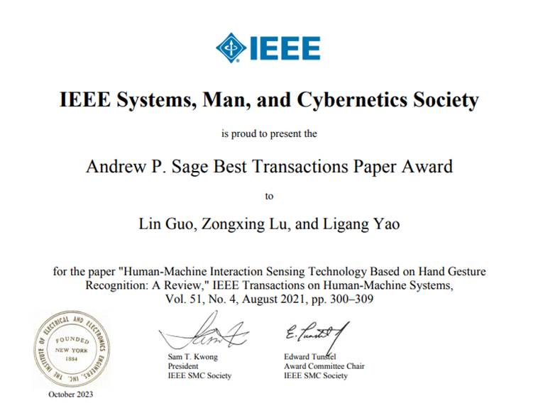 郭霖、卢宗兴、姚立纲教授共同撰写的论文“Human-Machine Interaction Sensing Technology Based on Hand Gesture Recognition: A Review”(IEEE Transactions on Human-machine Systems, 2021, 51(4): 300-309)荣获2023年IEEE SMC学会最佳论文奖(Andrew P. Sage Best Transactions Paper Award)。自1998年以来,Andrew P. Sage最佳论文奖每年从IEEE SMC学会出版的每个汇刊过去两年发表的近两千篇高质量论文中依据原创性、技术水平、对IEEE SMC感兴趣领域的潜在影响以及论文本身的写作质量等原则各遴选一篇论文授予该奖励。这是以海角视频