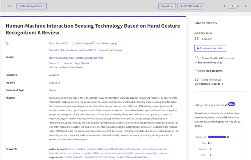 Human-Machine Interaction Sensing Technology Based on Hand Gesture Recognition: A Review论文旨在使读者能够系统、快速地了解手势识别的研究现状,揭示手势识别的基本问题和发展方向。文章以手势识别技术所采用的传感方法为切入点,通过总结近年来人机交互领域的研究成果,详细的阐述人机交互系统的研究现状,并展望未来人机交互领域的发展方向。目前,该论文在Web of Science上实时引用为55次。