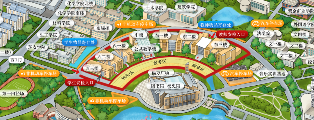 1、考生于上午7:40分,下午13:10分开始安检。安检区位于西三公共教学楼旁,考试依次排队通过智能安检门进行安检。安检时间30分钟,上午8:10分,下午13:40分前,考生必须全部通过安检区。