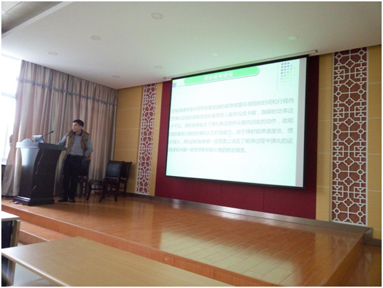 同学早早的在机械北楼等待蒋青山博士的到来,当蒋青山博士到场时,同学们以热烈的掌声欢迎他的到来。蒋青山博士是兵器科学和工程专业毕业的,所以蒋博士也花了些时间介绍了一些兵器方面的知识。蒋博士首先介绍了大口径直行大炮的的背景知识,如何区分大口、小口以及中口的直径,当直径处于20至100时属于小口,当小于155时属于中口,大于这个值即为大口。接下来蒋博士介绍了弹射输弹装置的建模,在建模时将该装置等效为均质旋转体以及等效为单自由度系统。简单的介绍完建模之后蒋博士又讲了该装置输弹的三个阶段:拖弹、进入和拖膛以及其他一些过程的分析,另外的点到了仿真和实验。在介绍完该装置的机理之后,蒋博士也指出了该弹射输弹装置一些存在的问题:第一个问题就是在该系统压力下会不稳定,第二就是平顺性有时不是非常高。当然蒋博士也提出了一些改进的意见:求解待定的射角和在该压力下满足理想初射速度所需的参数,然后对参数进行拟合,在随机射角下进行验证,最后调整该装置的姿势。讲完改进的意见之后,蒋博士最后得出了自己的结论:这是一种通过少量点计算对初始姿势也进行了参数的优化你较好简单容易的实现的拟合的优化方法,这解决了相对复杂的问题。