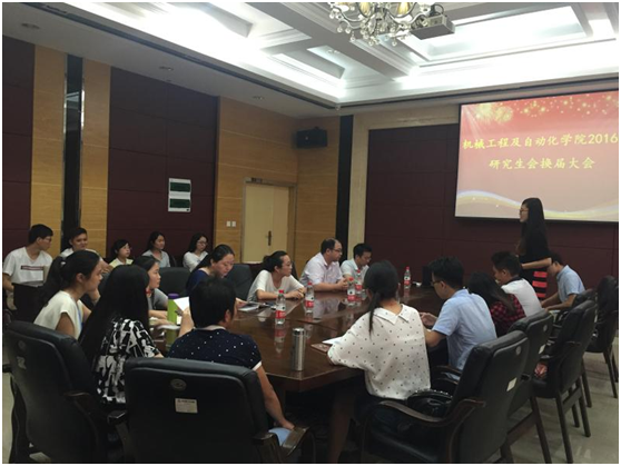 2016年研究生换届大会于机械南楼401圆满完成。出席本次换届大会的嘉宾有学院党委副书记林文麟老师、学院团委书记夏钢老师、学院团委副书记刘旭莹老师、研究生辅导员贾静老师、研究生一、二年级班长、2015届学院研究生会全体干部以及2016届学院研究生会全体干部。
