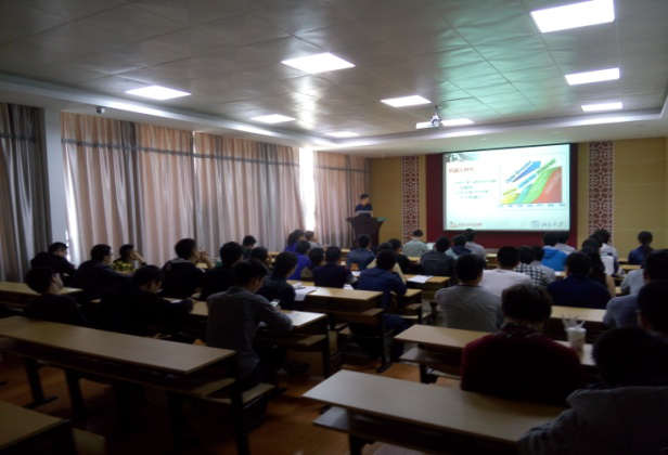 何炳蔚老师对谢广明教授做了一个简短的介绍,同学们报以热烈的掌声。谢广明教授在清华大学完成了本硕的学习,后在北京大学修读博士,其主要从事机器鱼的仿真模拟,目前已经取得了较好的科研成果。谢广明教授的研究团队主要做仿生机器鱼、仿生机器海豚、模块化机器鱼、两栖机器人。在2012年,其所研制的拍动翼自主机器鱼在北极成功首航。而且多次被胡锦涛、李克强、刘延东、陈至立、万钢等多位党和国家领导人视察,备受赞誉。讲解过程中,谢广明教授配以图片、短视频进行讲解,让同学们对实物有更直观的认识。然后,谢广明教授给同学们普及了一些水下机器人的基本知识,比如:水下机器人分为ROV(遥控水下机器人)和AUV(自主水下机器人),可用于军事、民用、科研,勘测海底矿产资源和发现新物种。而且传统的机器人存在多种问题:体积大、噪音大、隐形性差、水下任意方向移动时灵活性差等,所以很难被应用于实际海底狭小空间环境中勘测任务。接下来讲了目前水下机器人的发展动态,以及他们的团队对研究过程中一些因素的考虑,进行仿生感知,利用鱼的定位、鱼线等进行改进自己的设计,甚至希望将仿生机器鱼运用于改变自然,自然地引导其他真实鱼类的生物活动,让同学们深受启迪。最后,谢广明教授向大家介绍了他组织进行的机器人竞赛,指出这类型的竞赛不仅可以推进技术进步加强交流合作,而且是一个展示自己成果的好机会,有利于人才的全面培养,在具备专业能力的同时提高综合能力。本次学术报告交流会的目的在在于加强研究生同学对仿生机器鱼的了解,拓宽自己的知识范围,希望从事该方向研究的同学或感兴趣的同学能从中有所收获。而且也希望各位同学能从中国最高学府的学者身上学习一些优秀的专业素养,提高自身的修养。活动最后,同学们纷纷将自己比较关注的问题与他进行了交流,谢广明教授细心的对同学们的问题进行了解答,让同学们受益匪浅,得到了在场同学们的一致好评。