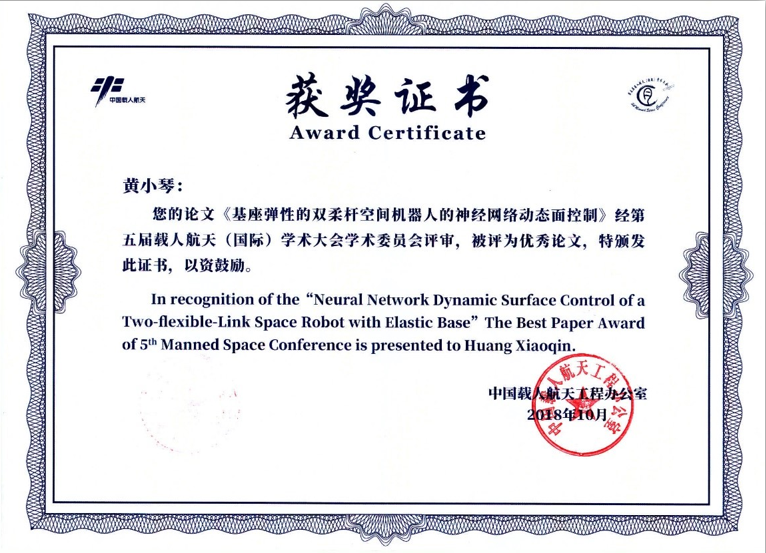 陈力老师课题组内五位同学的论文入选大会论文集,其中,博士研究生黄小琴同学提交的《基座弹性的双柔杆空间机器人的神经网络动态面控制》在大会征集的176篇主题论文中脱颖而出,入选大会优秀论文,取得了海角视频