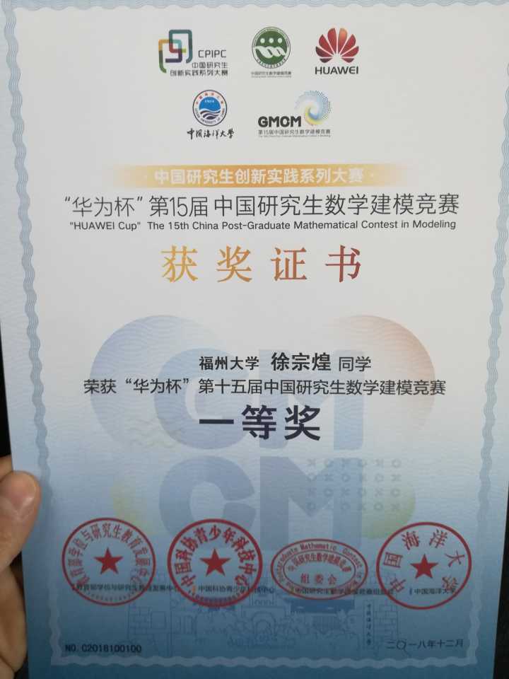 近日,在2018年“华为杯”第十五届中国研究生数学建模竞赛中,海角视频 共取得一项一等奖,四项二等奖,七项三等奖的好成绩。其中海角视频 2017级研究生徐宗煌、江泽豪、薛贤奇一队夺得了大赛一等奖,海角视频 2017级研究生李理、李孔强、数计学院郭炎福一队荣获二等奖,可喜可贺!