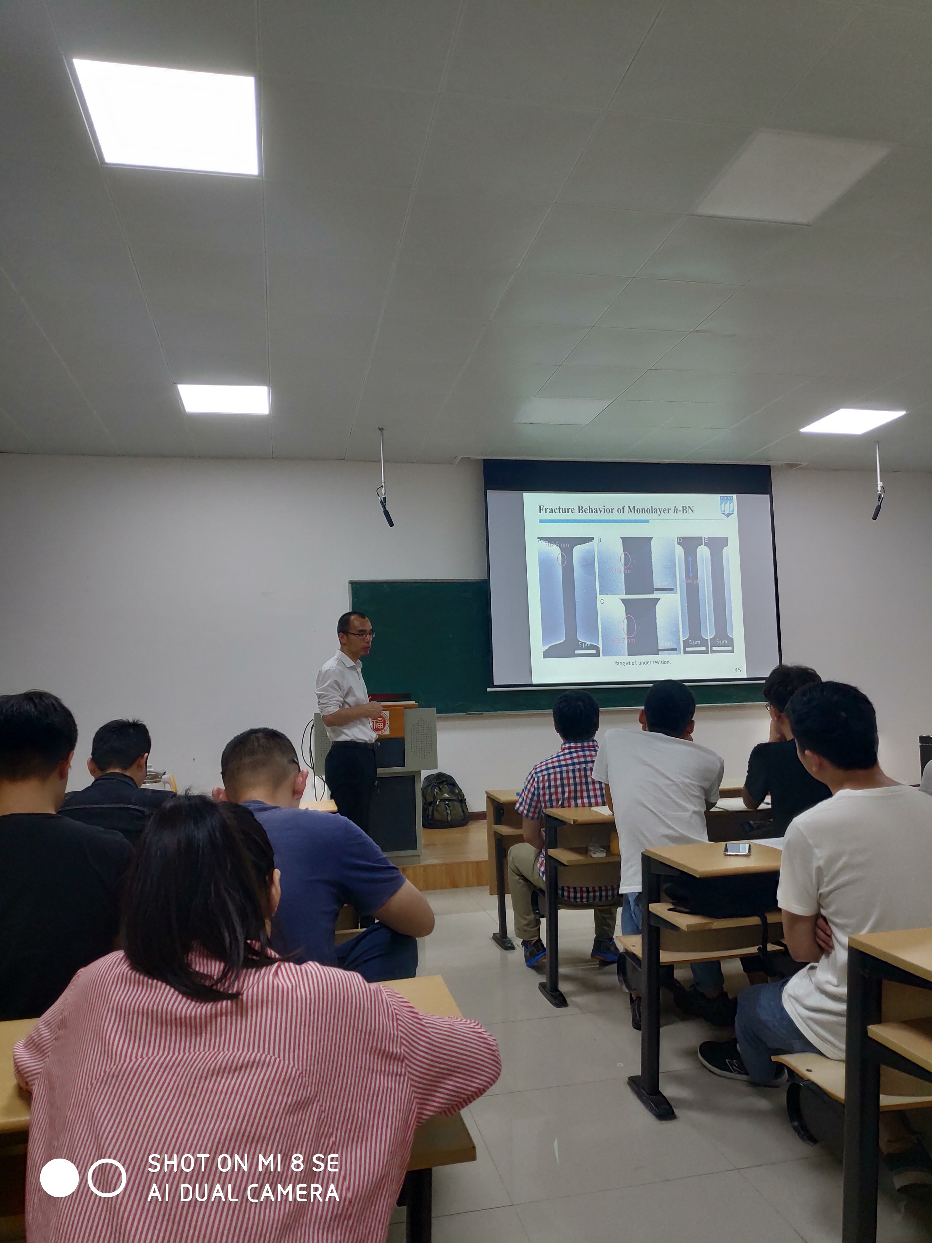 报告伊始,杨颖超教授首先介绍了二维材料相关的背景知识,为接下来的讲述做好了铺垫。接着,杨颖超教授开始深入浅出地讲解他的二维材料转移与机械性能表征的研究成果与经验。向同学们演示了纳米结构二维材料的分离过程,石墨烯是一种比较常见的二维材料。转移材料有液相转移法和固相转移法,通过不同的处理方式,得到低维度的材料,比如MoS2等。分离转移到衬板上,进行机械性能的测量,得到相关的力学性能。紧随其后,杨颖超教授谈到研究中遇到一些问题,实验材料的获取成功率很低,200份实验中只有不到6次的实验结果达到要求,以及研究当中产生的一些小trick解决了困扰将近一年的难题。是的,研究中或许是枯燥的,但也会有一些小惊喜。讲座后期,教授又讲解了材料的裂缝问题,二维材料脆性较强,容易产生裂缝,教授采取在材料中加入一维材料提升材料的韧性。实验多次难得成功了一次,让同学们感受到了科研的严谨。在杨颖超教授结束本次学术报告之前,同学们纷纷将自己比较关注的问题与他进行了交流,杨颖超教授耐心细致的进行了解答,掀起了全场的高潮。