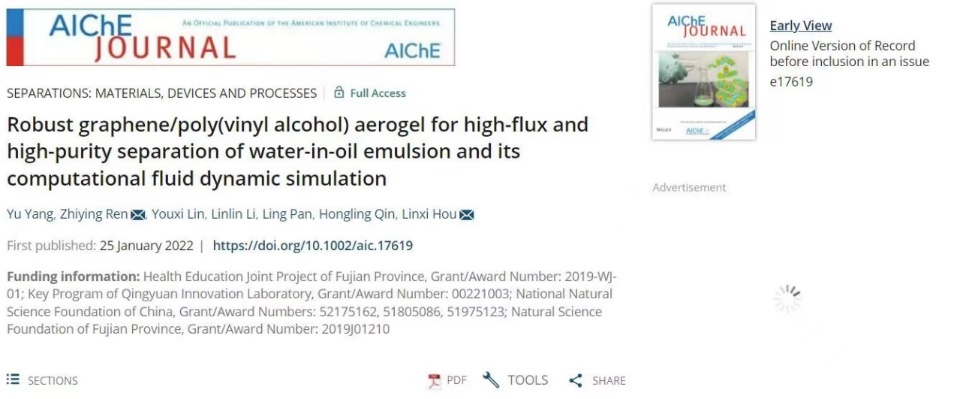 杨宇博士(2020级)作为第一作者,在化工领域国际顶级期刊AICHE JOURNAL上在线发表了研究成果“Robust graphene/poly(vinyl alcohol) aerogel for high-flux and high-purity separation of water-in-oil emulsion and its computational fluid dynamic simulation”。该成果以海角视频