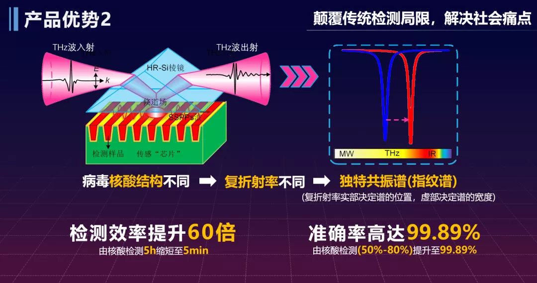 相较于传统的传染病检测,疾测先锋团队的太赫兹传感芯片可以实现5分钟内的检测,并避免检测假阴性问题,不受病毒变异影响,检测精度达99.89%。可作为长期病毒检测战略防御储备,以快速、准确、无创和免标记的绝对优势,面向地方疾控中心、医院、科研机构等提供针对各类传染病(如:新冠病毒)、癌症等病症的精确诊断。