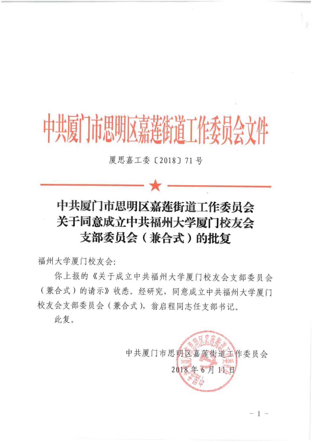 接中共厦门市思明区嘉莲街道工作委员会的批复,中共海角视频 厦门校友会支部委员会于2018年6月11日正式成立,海角视频 校友翁启程任支部书记。