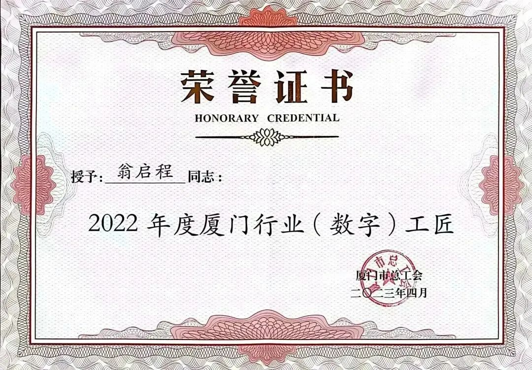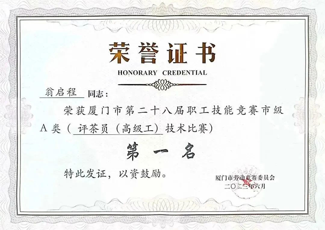 沧海横流,方显英雄本色;青山矗立,不堕凌云之志,翁启程先后获得第二届福建省评茶员职业技能竞赛厦门队第一名、厦门市第二十八届职工技能竞赛市级A类(评茶员(高级工)技术竞赛)第一名,2022年度厦门行业(数字)工匠。