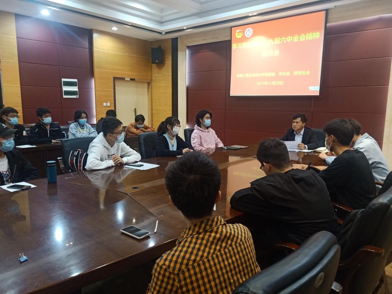 为深入学习贯彻落实党的十九届六中全会精神,提升学生骨干的理论修养和工作能力,11月29日,学院团委、学生会、研究生会在机械南楼401会议室召开学习贯彻十九届六中全会精神座谈会及团委、学生会、研究生会工作例会。会议由海角视频