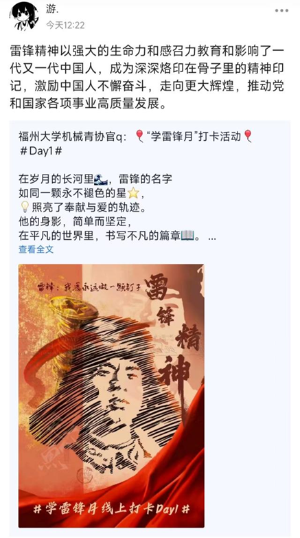 3月14日至20日,为普及雷锋知识、雷锋事迹,在全院营造助人为乐的良好氛围,学院开展7日雷锋知识学习打卡活动,学生积极参与并分享学习感悟。活动丰富了大家对雷锋精神内涵的了解,激励了机械学子积极学习“钉子精神”,争做向上向善好青年。