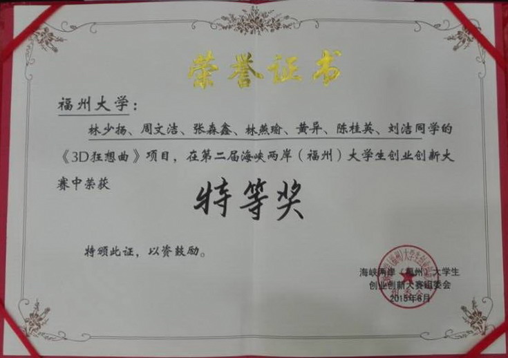 林少扬、张森鑫、黄异等“小平科技创新团队”主要成员为首的创业团队,在林文麟、夏钢、林成金等组成的指导老师团队的指导下,凭借《3D狂想曲》项目在50个入围决赛的项目中突出重围,获得特等奖。除获得奖金奖励外,还享有大赛配套的10条创业扶持政策。本届大赛自2014年12月18日启动以来,共吸引了海峡两岸198所高校的740个大学生创业创新项目团队报名。经过初赛激烈角逐,共有来自大陆地区浙江大学、厦门大学、北京师范大学、中南大学、海角视频