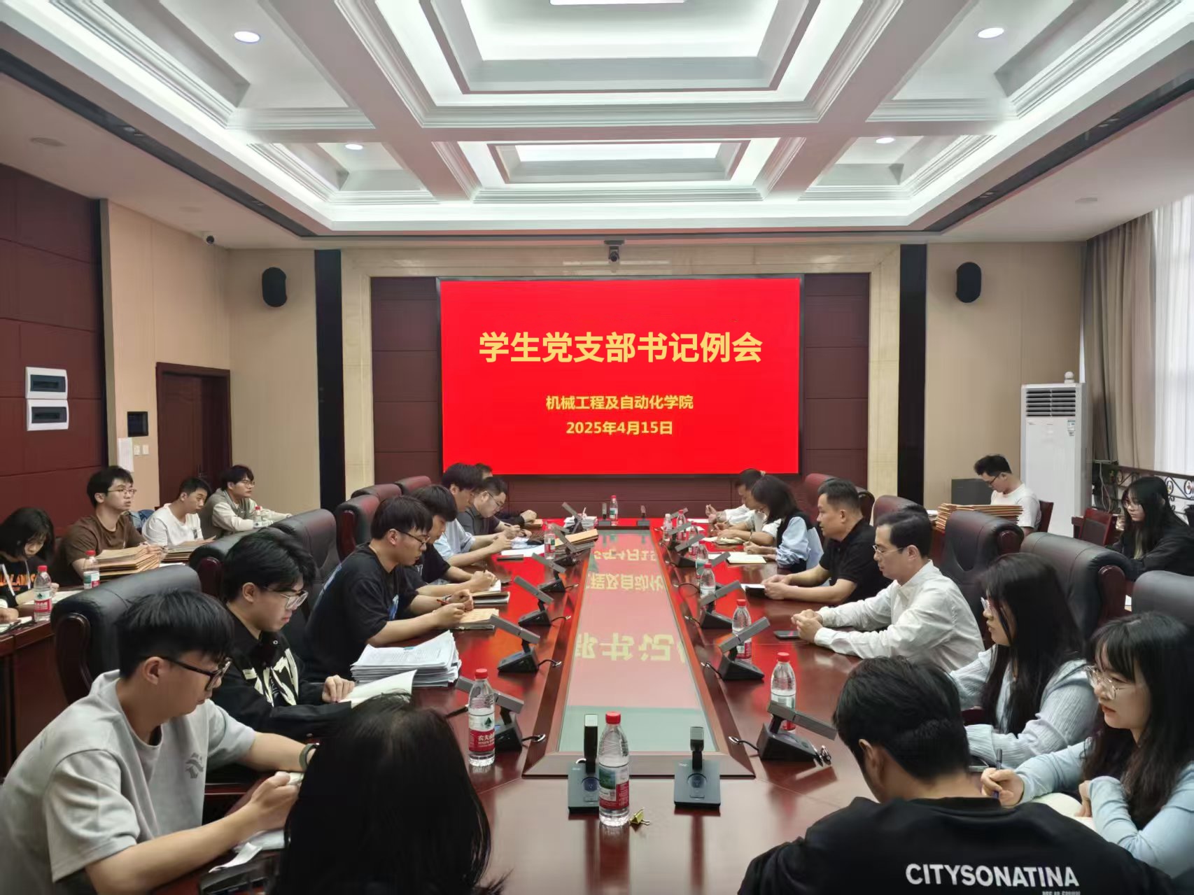 4月15日,机械学院召开学生党支部书记工作例会,学院党委书记陈伟民、党委副书记兼纪委书记孙鋆出席会议并讲话,全体辅导员和学生党支部书记参加会议。